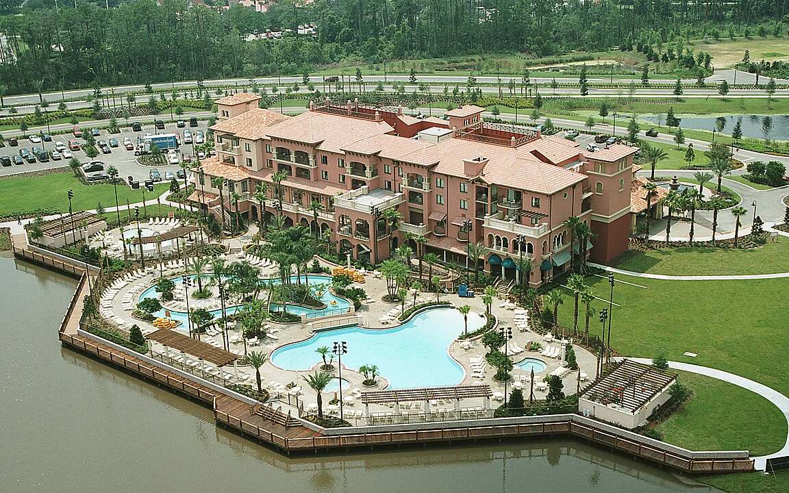 The resort’s extensive amenities include a fitness center, three distinct pool areas, a lazy river, and access to the adjacent Bonnet Creek Golf Course. Surrounded by the Walt Disney World Resort, the project required a distinctive design approach—one that could hold its own alongside world-renowned themed environments.