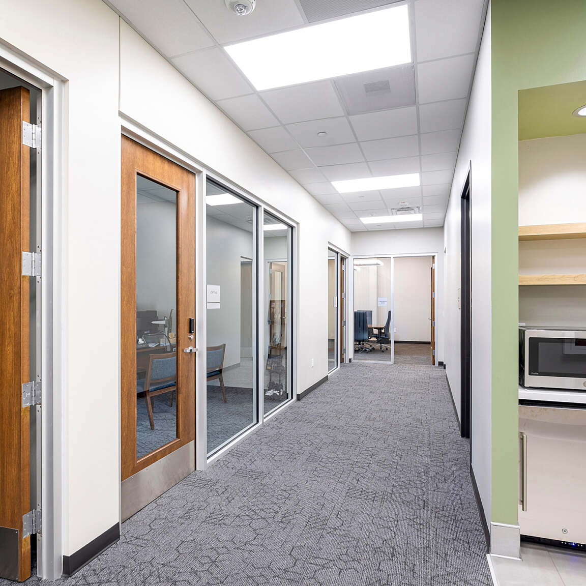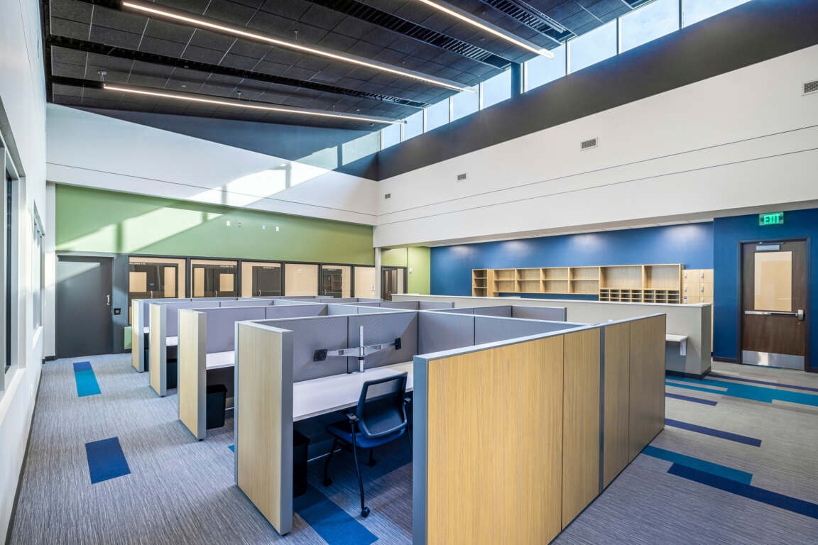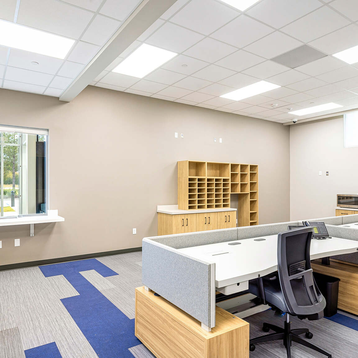 Law enforcement office spaces are designed to promote a welcoming atmosphere while promoting security and professionalism. Strategically placed high windows allow natural light to fill the interior, enhancing both the brightness and openness of the space, all while preserving privacy and ensuring safety.