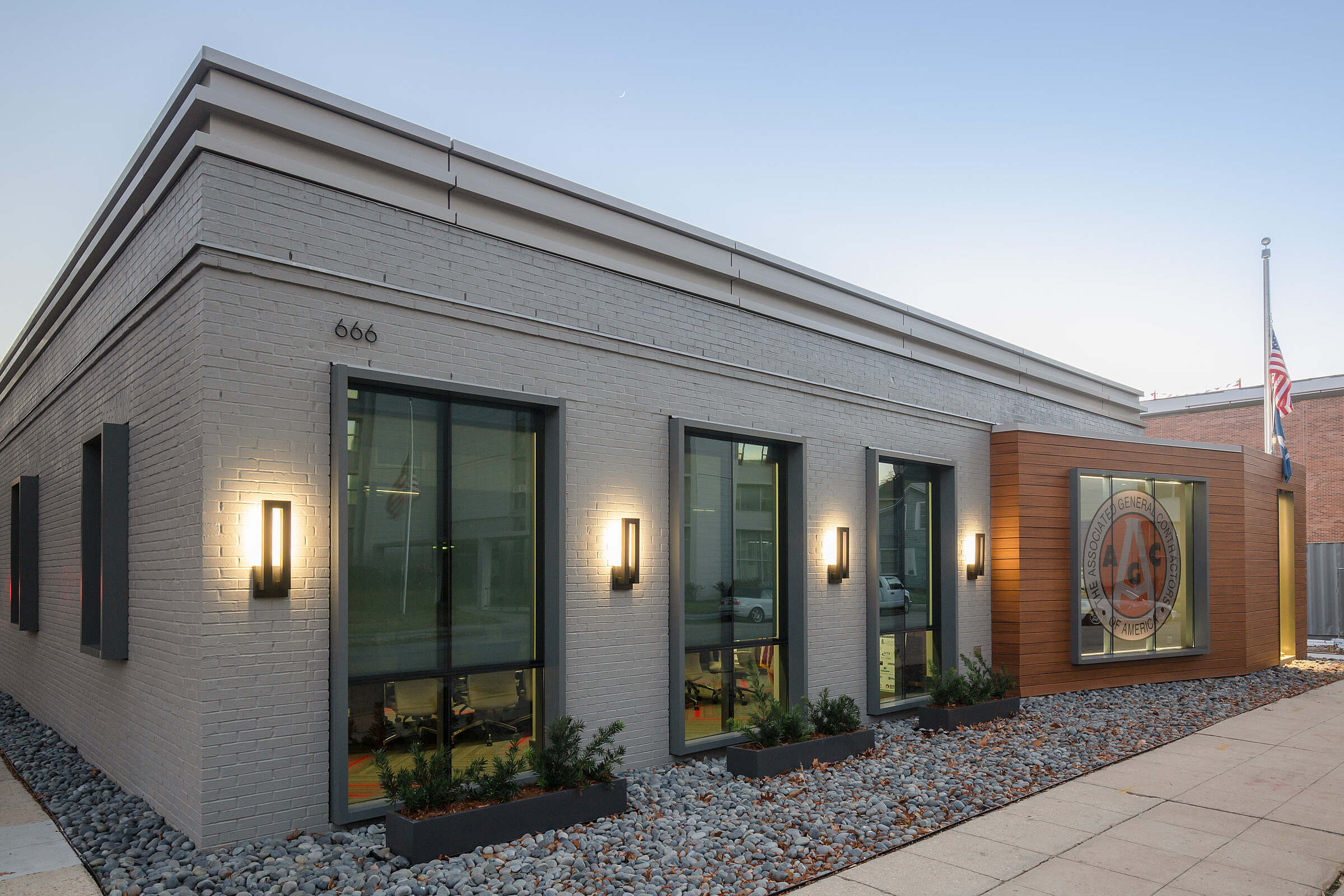 The building on the right is the company’s training facility and also houses Human Resources offices. The facility allows the company to evaluate prospective employees on site via testing kiosks and computers spread across two classrooms. Applicants can also demonstrate their hard skills in two testing bays. Careful design keeps public and private spaces separate and secure, and ample lighting of both facilities was important for security purposes.